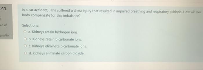 Kidneys retain bicarbonate ions kidneys eliminate carbon dioxide kidneys eliminate bicarbonate ions kidneys retain hydrogen ions. In a car accident Jane suffered a chest injury that resulted in impaired breathing and respiratory acidosis. In a car accident jane suffered a chest injury that resulted in impaired breathing and respiratory acidosis.